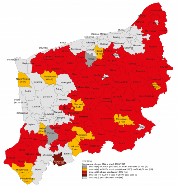 Trwałą poprawę sytuacji społeczno-gospodarczej odnotowano w gminach Pyrzyce i Rymań – gminy objęte przez trzy lata (2017, 2018 i 2019) przejściową SSW obecnie znajdują się poza SSW. Gminy Chociwel oraz Pełczyce po raz pierwszy odnotowały poprawę i weszły do obszaru przejściowego. Gmina Boleszkowice po roku w SSW odnotowała poprawę i wróciła do obszaru przejściowego. Po raz pierwszy SSW została objęta gmina Nowogródek Pomorski.